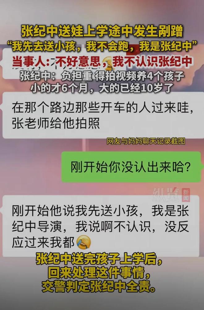 张纪中在把孩子送到学校之后,又回来处理了这件交通事故,交警判定,张纪中是全责。