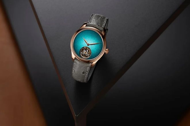 表盘摒弃品牌标志与时标,以浓郁的绿松石色作为震撼视觉的亮点,悬浮灵动的飞行陀飞轮与深邃迷人的表盘交相辉映。为了获得这种独特的绿松石色调,专业工匠遵循严苛的制作工序:首先在白金基底上镌刻出锤击纹理,随后,以精湛手艺分步逐次涂覆半透明珐琅颜料。三种不同颜料叠加,通过反复烧制,将颜料融合,又不减损色彩的浓郁度,最终呈现出明亮的渐变效果,在深邃与通透之间变幻无穷。手腕转动间,光线在盘面流转,勾勒出令人沉醉的光影游戏。这款美轮美奂的腕表采用直径40毫米5N红金表壳,搭载配备陀飞轮的HMC 805自动上链自产机芯,是制表工艺与美学艺术的至高融合。