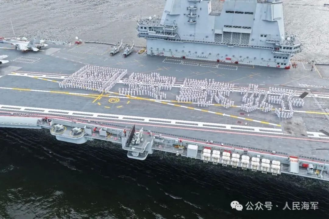 2025年7月3日,山东舰航母编队驶入香港维多利亚湾。山东舰官兵在飞行甲板上排成“国安家好”字样,向香港同胞送去祝福。