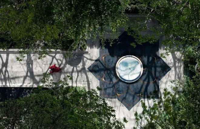 ”用“帝王黑”天然奢石等材料,经手工切割打磨拼装勾勒出玉兰花造型,旁立百年广玉兰古树,形成传统与现代的时空对话。